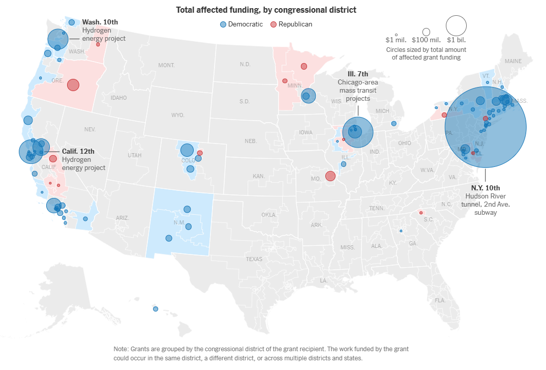 In the last 16 days, the White House has cut approximately $27.2 billion from Democratic districts compared to about $0.7 billion in GOP districts (all but two of which are located in blue states). To state the situation as clearly as possible: the president is unilaterally stripping funding from Democratic-voting areas and redirecting funding to Republican-voting areas. He views our federal tax dollars as his own money to use to reward his supporters and punish anyone who didn’t vote for him, as he said on Tuesday:
