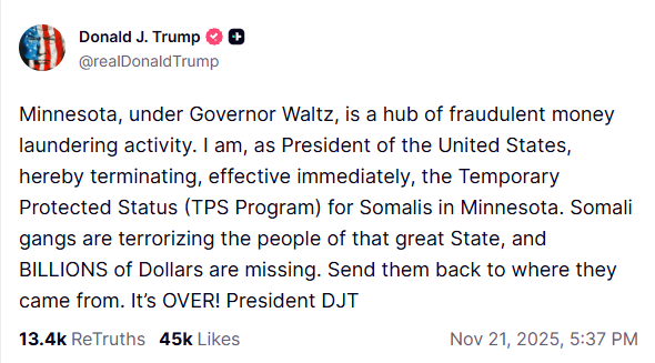 Nov. 22, 2025: Trump instructed DHS Secretary Kristi Noem to end Temporary Protected Status eligibility for Somali immigrants residing in Minnesota. “Somali gangs are terrorizing the people of that great State, and BILLIONS of Dollars are missing,” Trump wrote on Truth Social. “Send them back to where they came from. It’s OVER!”